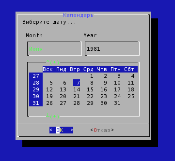 USERDATE=`$DIALOG --stdout --title "Календарь" --calendar "Выберите дату..." 0 0 7 7 1981`