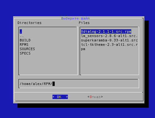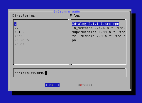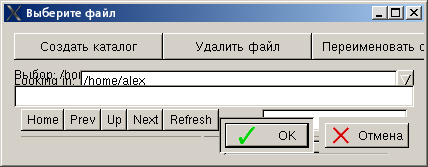 (В реализации этого элемента есть ошибка. Если используется dialog, то всё отрабатывается корректно, а в случае с Xdialog строка "Строка 2" не переносится на новую строку. Использьзование тоже \n не помогает. -- прим. А.К.)Вот пример простейшего диалога для выбора файла (см. рисунок 11, 12):