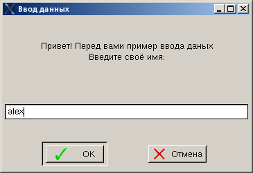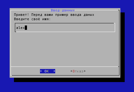 $DIALOG --title "Ввод данных" --clear \ --inputbox "Привет! Перед вами пример ввода даных\nВведите своё имя:" 16 51 2> $tempfile