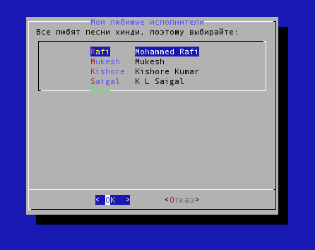 --menu "Все любят песни хинди, поэтому выбирайте:" 20 51 4 \