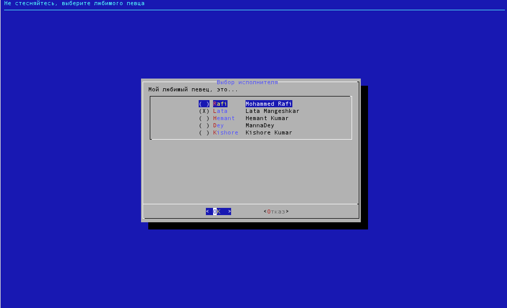 $DIALOG --backtitle "Не стесняйтесь, выберите любимого певца" \