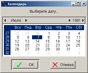 (Правда есть пара "но", на которые следует обратить внимание. На первое "но" вы наступите, если попробуете последний пример выполнить, используя Xdialog (см. рисунок 13). Получается, что добиться 100%-го портирования из текста в графику невозможно -- приходится менять размер окна. Второе "но" -- это навигация по файловому дереву. В текстовом режиме (dialog) у меня это не получилось -- клавиша "Enter" воспринимается как окончательный выбор и использовать её для перемещения по подкаталогам не удаётся. В графике (Xdialog) с этим проще -- там поддерживается мышка и перемещение по подкаталогам не вызывает проблем. -- прим. А.К.)Информация о годе, месяце и дне выводится на отдельных панелях. Если значение дня,месяца или года не указано, либо оно отрицательное, то используются системная дата. (Работает только в dialog. При частичном отсутствии начальных значений даты (например, вы не указали год) Xdialog выдаёт сообщение об ошибке. Указать в качестве начального значения , например, 1000-й год не получится -- dialog воспринимает это как неверное значение и указывает текущую дату. Xdialog в этом случае выдаёт сообщение об ошибке. -- прим. А.К.) Для изменения значений можно использовать стрелки управления курсором, либо воспользоваться горячими клавишами, используемыми в vi при навигации по тексту: h, j, k и l. (Верно для dialog. В Xdialog используются управление при помощи мышки и только навигация по дням месяца возможна при помощи клавиш управления курсором. -- прим. А.К.) Если год устанавливается равным 0, то по умолчанию используется значение текущего года. Результат выводится в формате день/месяц/год (см. рисунок 14, 15).