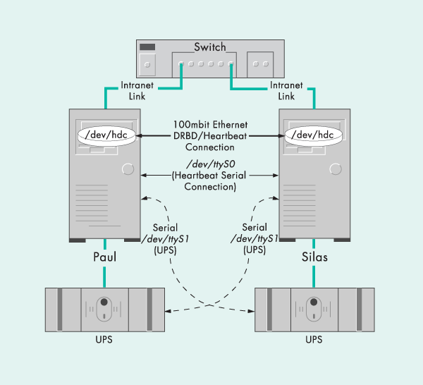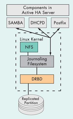 Пакет Heartbeat (сердцебиение - прим.пер.) используется для обнаружения сбоев и управления ресурсами кластера. Пакет DRBD обеспечивает постоянную синхронизацию раздела /home на обеих системах. DRBD можно представлять как RAID1 (зеркалирование) через сеть.