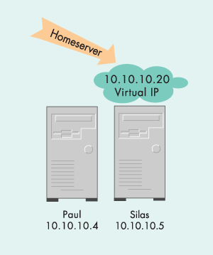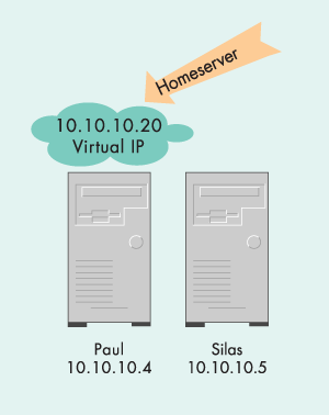 В обычном режиме функционирования кластера, показанном на рисунке 3, система paul предоставляет сервисы и IP адрес 10.10.10.20 (homeserver) принадлежит ей. При сбое компьютера paul, система silas перенимает IP-адрес homeserver и соответствующие сервисы. Если клиент попытается обратится к homeserver, когда paul не работает, ответит система silas. Эта ситуация изображена на рисунке 4. Итак мы разобрались с тем, как это все работает. Пора переходить непосредственно к установке и настройке.